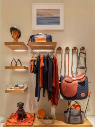 Upon entering this space made of organic textures reminiscent of its coastal environment, visitors are welcomed by women’s silk and discover a central section showcasing jewellery and watches surrounded with equestrian accessories. Introducing passages peppered with oakwood panels and mineral hues, the fantasy jewellery facing the entrance leads to the perfumes on the right.