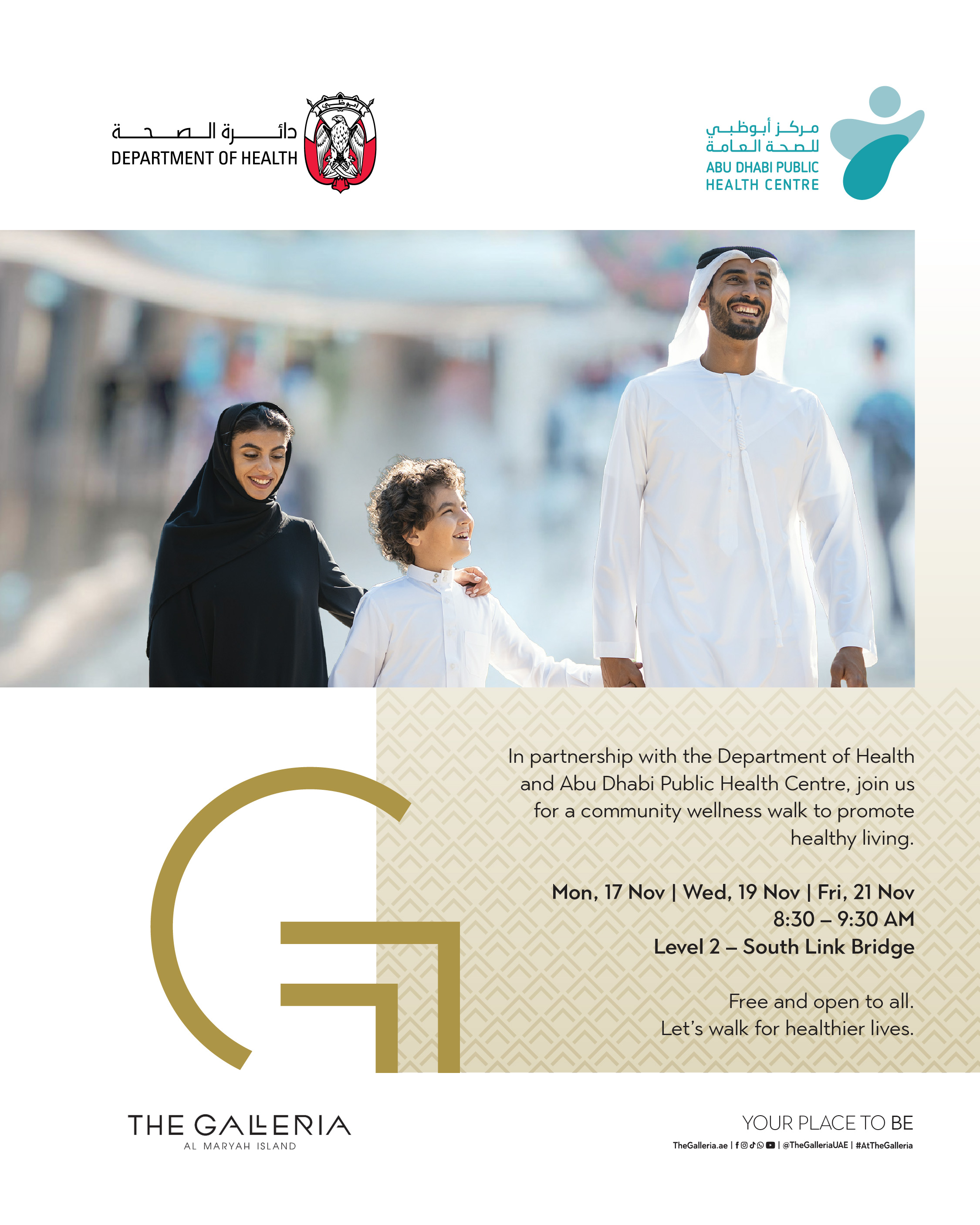 Get Active with us!The Abu Dhabi Department of Health (DoH) and Abu Dhabi Public Health Centre (ADPHC) bring an interactive health experience to The Galleria Al Maryah Island from 17–23 November 2025,